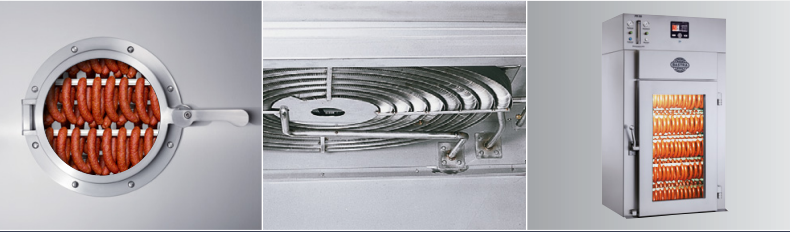 ECHIPAMENT SPECIAL · dispozitiv de răcire pentru conectarea la echipamentul frigorific al clientului · A treia viteză a aerului pentru coacere, opțional variabilă · duș de răcire încorporat · deblocare automată a ușii · Circulație alternativă a aerului orizontală sau verticală pentru produsele care sunt așezate orizontal · curățător catalitic a evacuarii · șină cu balamale pentru a compensa denivelările din podea · combinarea sistemelor de generare a fumului oferite