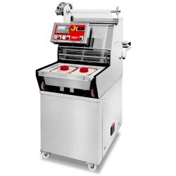 Utilizat pentru tavi cu ambalare in vid. Ambalare sub vid MAP și Skin-Pack. Matriță personalizabilă. Potrivit pentru tava de 115 mm. Fara placa de etansare, matrite sau compresor de aer. Pompa de vid de 40 m³/h.