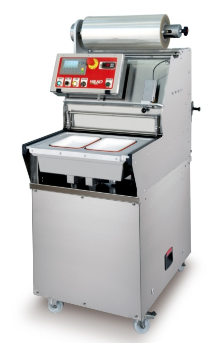 Utilizat pentru tavi cu ambalare in vid. Ambalare sub vid MAP și Skin-Pack. Ambalare tavi mari. Conceput pentru supermarketuri, catering si gastronomie. Pompa de vid 60 m³/h.