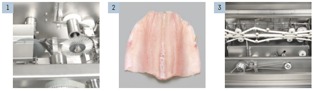 1 – Intestinele pot fi îndepărtate foarte eficient prin vid înainte de filetare. În acest fel, multe dintre bacteriile care pot provoca contaminarea mai târziu în procesul de filetare sunt îndepărtate. Capul, cozile și ramele pot fi, de asemenea, îndepărtate prin aspirare.